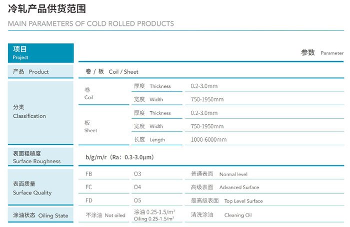 五条冷轧线,年产量 750 万吨。可供厚度 0.2-3.0mm,宽度 750-1950mm 的冷轧产品。