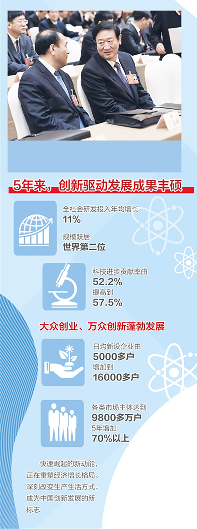 这5年,创新驱动发展成果丰硕。全社会研发投入年均增长11%,规模跃居世界第二位;科技进步贡献率提高了5.3个百分点;载人航天、深海探测、量子通信、大飞机等重大创新成果不断涌现;高铁网络、电子商务、移动支付、共享经济等引领世界潮流……这一切,都源于我们实施的创新驱动发展战略。在今年两会上,代表委员围绕“创新”这个关键词,有讲不完的话题。