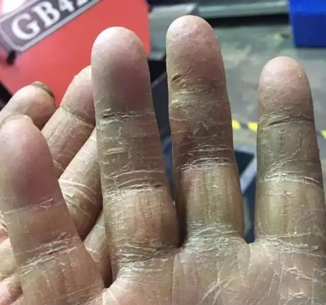手掌像老树皮,干枯、开裂;