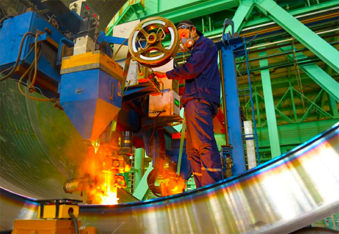 ▲中国一重大连核电石化公司石化筒节生产场景