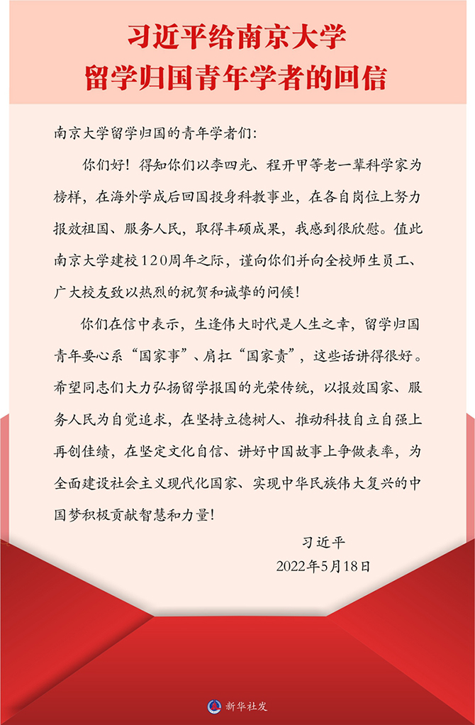 习近平在回信中说,得知你们以李四光、程开甲等老一辈科学家为榜样,在海外学成后回国投身科教事业,在各自岗位上努力报效祖国、服务人民,取得丰硕成果,我感到很欣慰。值此南京大学建校120周年之际,谨向你们并向全校师生员工、广大校友致以热烈的祝贺和诚挚的问候!
