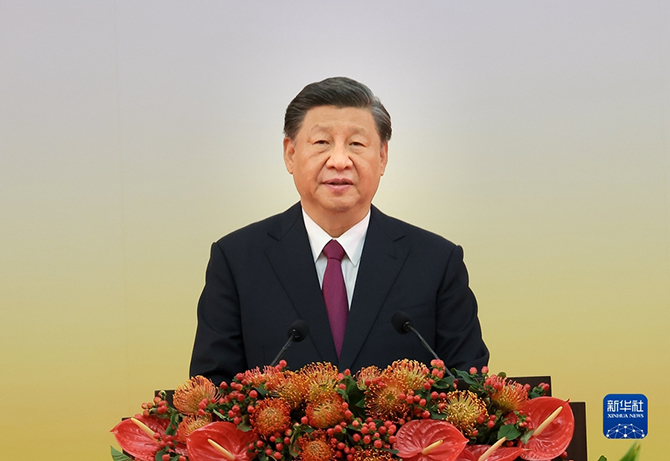 在热烈的掌声中,习近平发表了重要讲话。他首先向全体香港居民致以诚挚的问候,向新就任的香港特别行政区第六任行政长官李家超和第六届政府主要官员、行政会议成员表示热烈的祝贺,向支持“一国两制”事业、支持香港繁荣稳定的海内外同胞和国际友人表示衷心的感谢。