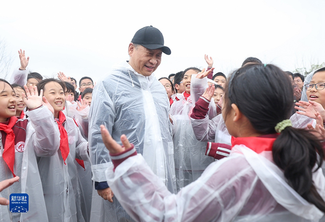 4月4日,党和国家领导人习近平、李强、赵乐际、王沪宁、蔡奇、丁薛祥、李希、韩正等冒雨来到北京市朝阳区东坝中心公园参加首都义务植树活动。这是植树后,习近平同在场的中小学生亲切交谈。(新华社记者 鞠鹏 摄)
