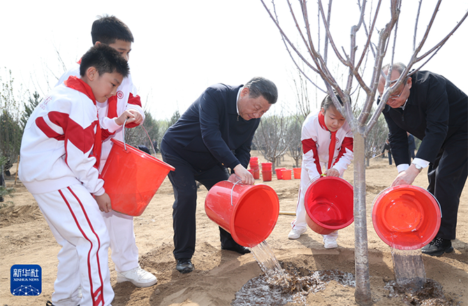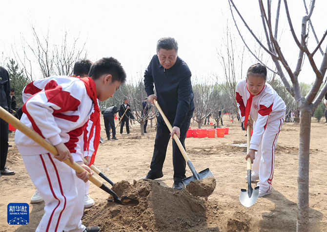 挥锹铲土、培土围堰、提水浇灌……习近平接连种下油松、黄栌、元宝枫、樱桃、红叶碧桃、侧柏等多棵树苗。习近平一边植树,一边询问孩子们的学习生活、劳动锻炼情况。他强调,广大青少年是祖国的未来,从小要积极参加劳动、植树造林,把绿色的种子种进心里,养成尊重自然、热爱自然的意识,勤奋学习、锻炼身体、茁壮成长,德智体美劳全面发展,努力成为国家栋梁。植树现场一派热火朝天的劳动景象,领导同志们同大家一起培土浇水,气氛热烈。