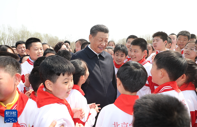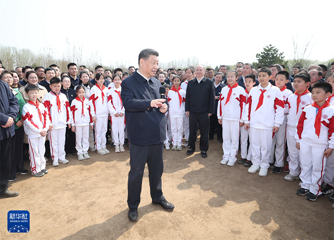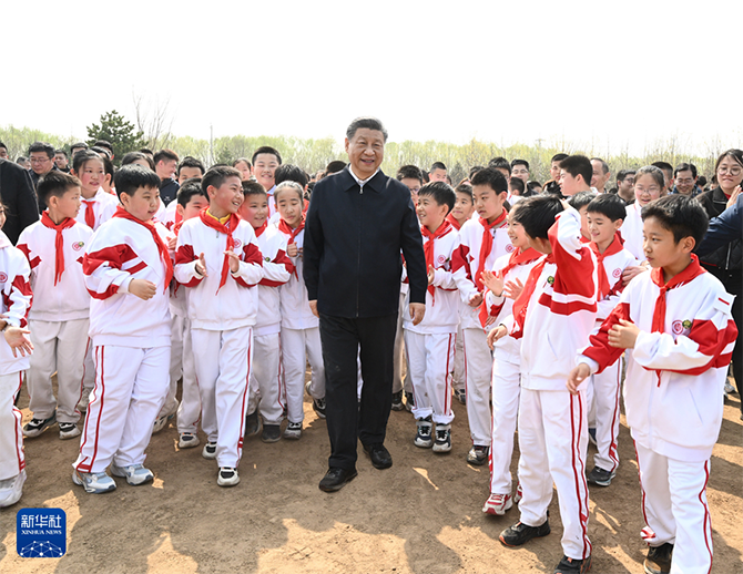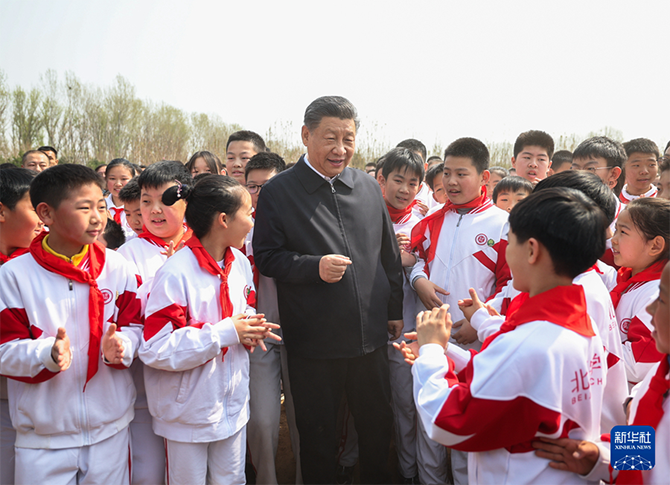 4月3日,党和国家领导人习近平、李强、赵乐际、王沪宁、蔡奇、丁薛祥、李希、韩正等来到北京市通州区潞城镇参加首都义务植树活动。这是习近平同少先队员在一起。新华社记者 李学仁 摄