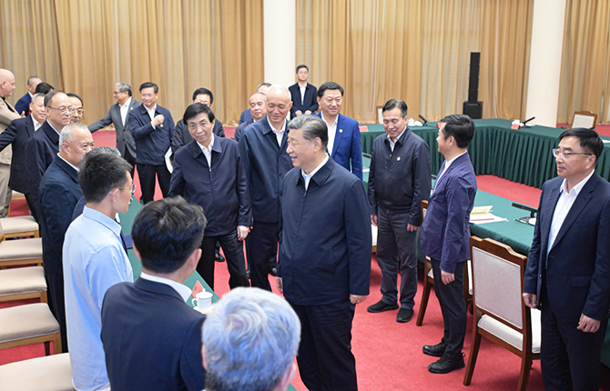 5月23日下午,中共中央总书记、国家主席、中央军委主席习近平在山东省济南市主持召开企业和专家座谈会并发表重要讲话。这是习近平同参会的企业和专家代表亲切交流。新华社记者李涛摄