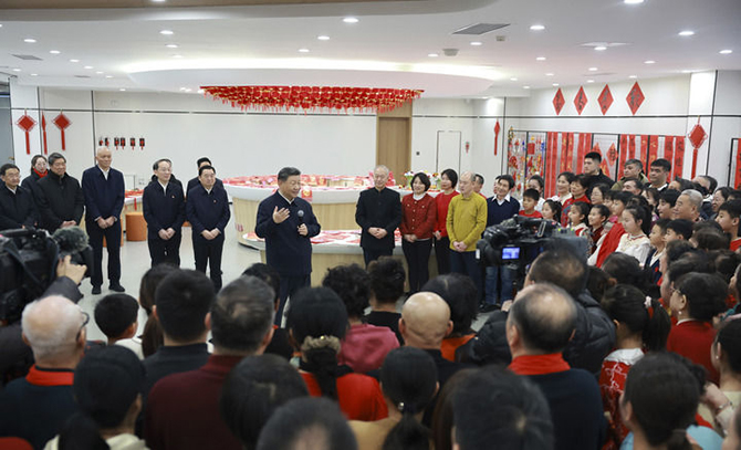 社区党群服务中心里,一些社区居民在写春联,孩子们编着中国结。习近平来到他们中间,不时赞赏他们的作品,勉励他们更好传承弘扬中华优秀传统文化。习近平还饶有兴致地欣赏了社区退休人员表演的笛子合奏曲。他深情地对大家说,过好春节意味着新一年有一个好的开端,家家户户幸福生活、老老少少开心快乐,就是人间美景。我们要一起努力,让这美景越来越靓丽。