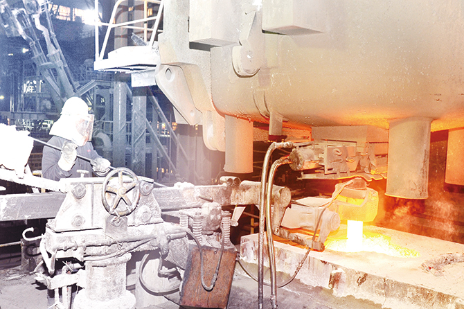 股份炼钢总厂一分厂连铸一作业区板坯大包岗位职工正在进行听渣作业。