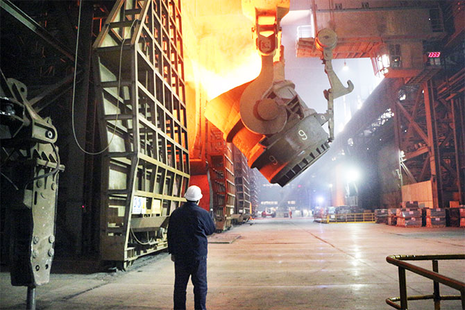股份炼钢总厂四分厂职工正在转炉前指挥兑铁作业