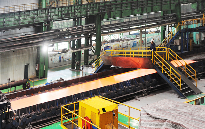 股份中厚板厂厚板线正在生产超薄超宽高强船板。