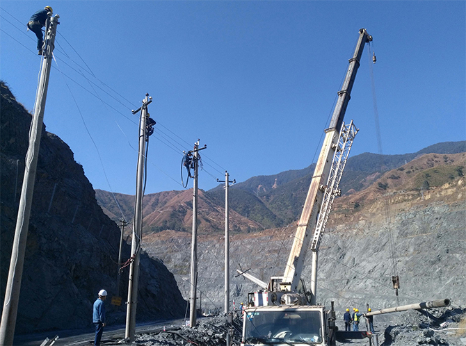 1月11日攀钢矿业攀枝花铁矿采矿作业区外线电工利用中午生产间隙架设高压线