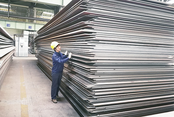 股份鲅鱼圈分公司厚板部职工正在检查钢板物料号