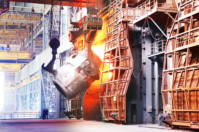 股份炼钢总厂三分厂转炉前正在进行兑铁水作业