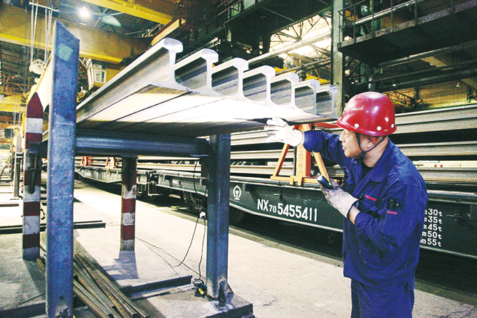 股份大型厂轨梁分厂职工正在对即将销往国外的重轨进行表面质量检查