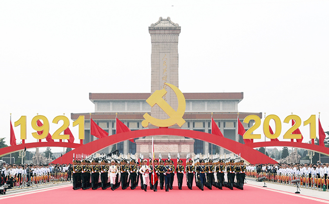 天安门城楼庄严雄伟,城楼红墙正中悬挂着毛泽东的巨幅彩色画像。天安门广场上,人民英雄纪念碑巍然矗立。纪念碑北侧,高7.1米、宽7.1米的中国共产党党徽和“1921”“2021”字标格外醒目。广场东西两侧,100面红旗迎风招展。