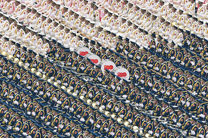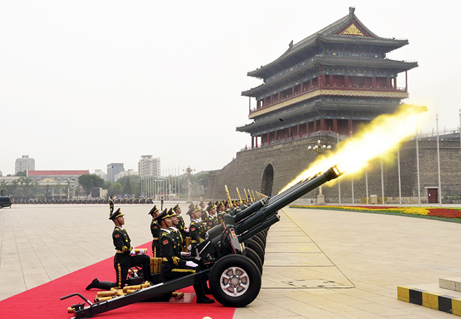 全体肃立,100响礼炮响彻云霄,国旗护卫队官兵护卫着五星红旗,迈着铿锵有力的步伐,从人民英雄纪念碑行进至广场北侧升旗区。中国人民解放军联合军乐团奏响雄壮的《义勇军进行曲》,全场齐声高唱中华人民共和国国歌,鲜艳夺目的五星红旗冉冉升起,在天安门广场上空迎风飘扬。