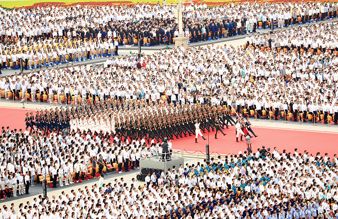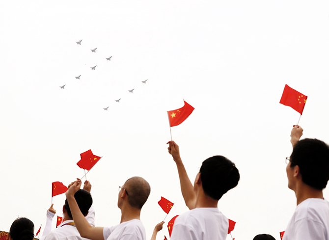 雄鹰翱翔,振翅长空。7时55分许,中国人民解放军71架战机飞向天安门广场,向党致敬,向祖国致敬,向人民致敬。空中护旗梯队拉开飞行庆祝表演序幕,5架直升机分别悬挂中国共产党党旗和写有“伟大的中国共产党万岁”“伟大的中国人民万岁”“伟大的中华人民共和国万岁”“全国各族人民大团结万岁”的条幅迎风向前。随后,直升机、战斗机分别组成“100”“71”字样掠过长空,15架歼-20飞机组成3个梯队呼啸而过,教练机拉出10道彩烟,精彩的表演激起一阵阵欢呼声。