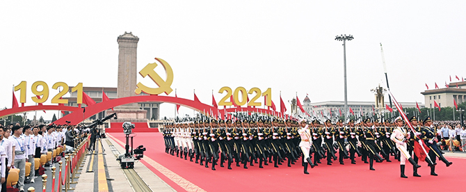 天安门广场上的大型电子屏幕中出现了钟摆的画面。1921、1931、1941……2021,随着钟摆,年份数字依次显现。8时整,象征着巨轮启航的汽笛声响起,庆祝大会开始。